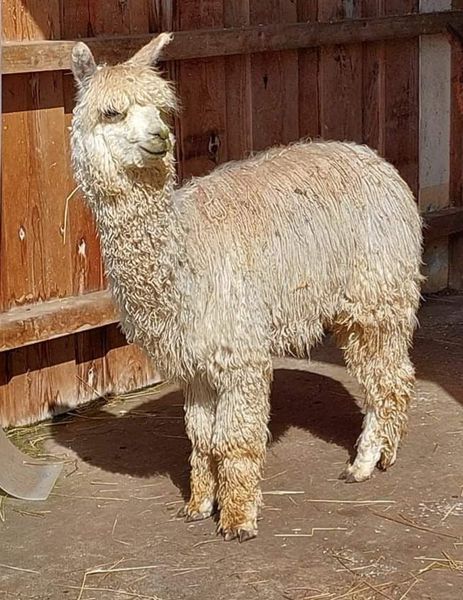 Fein im Vlies , volle Bewollung mit starkem Wachstum, ein sehr typvoller Suri Junghengst mit bestem Pedigree .